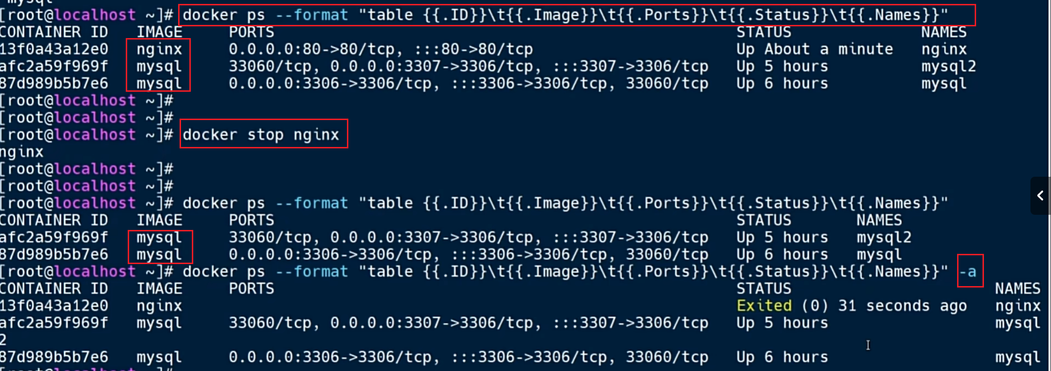 |nginx| 要使用的镜像名称(官方最新版) |6.查看正在运行的容器列表 docker ps --format(按格式输出) -a(输出全部)