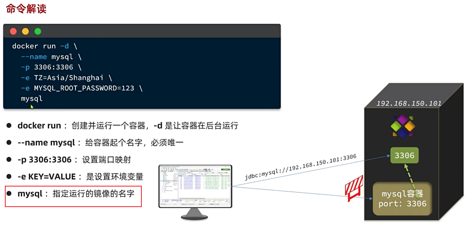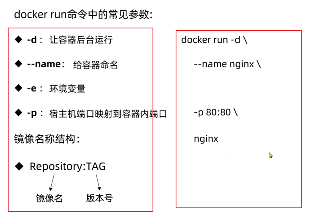 | docker run | 创建并启动一个容器(一次性命令) | docker run -d -p 80:80 nginx |