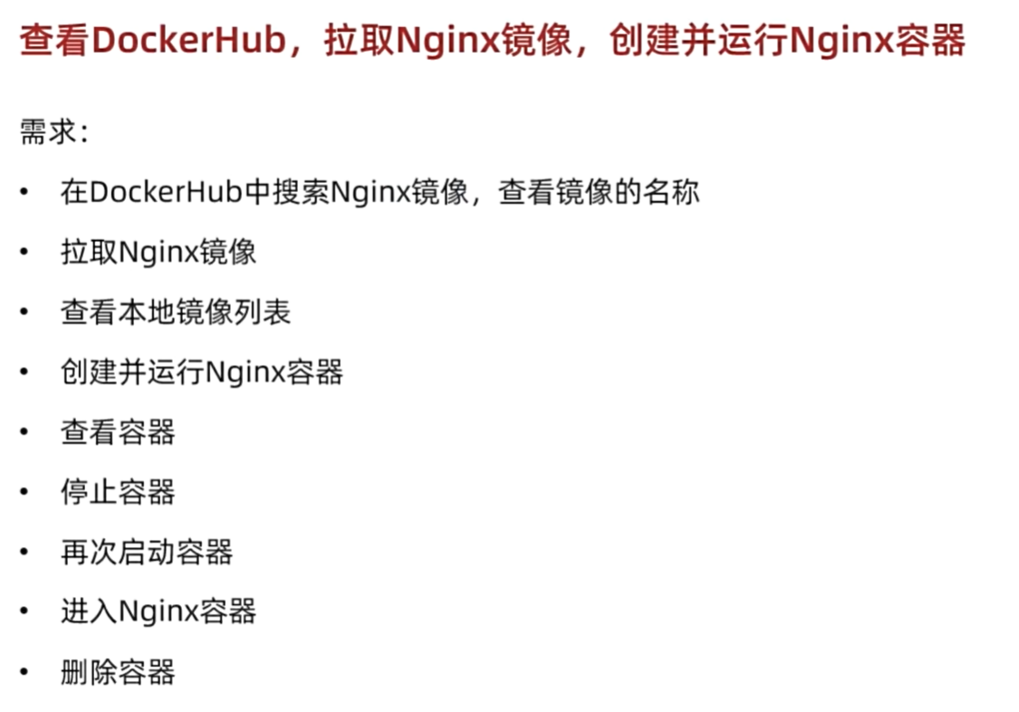 | docker exec | 进入正在运行的容器里执行命令 | docker exec -it my-nginx bash |