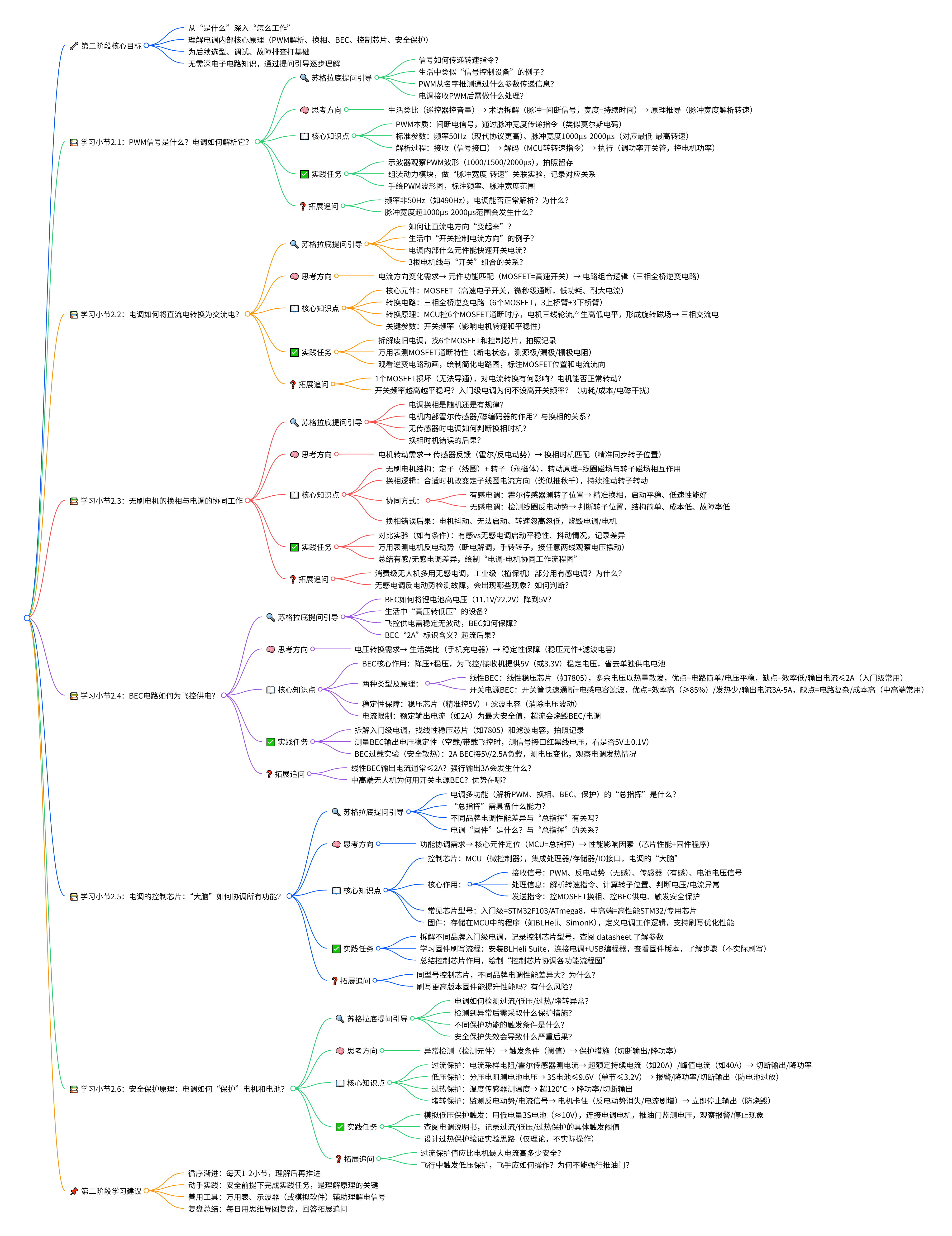 | 2.5 电调的控制芯片:"大脑"如何协调所有功能? | 1. 电调有很多功能:解析PWM信号、控制MOSFET换相、BEC供电、安全保护,这些功能需要一个"总指挥"来协调,你觉得这个"总指挥"是什么? 2. 这个"总指挥"需要具备什么能力?(提示:接收信号、处理信息、发送指令) 3. 不同品牌的电调性能差异,是否和这个"总指挥"的性能有关? 4. 电调的"固件"是什么?和"总指挥"有什么关系? | 从"功能协调需求→核心元件定位→性能影响因素"推导:电调的"控制芯片"是核心指挥元件,负责协调所有功能;芯片性能和固件程序直接决定电调的响应速度、稳定性等性能。 | 1. 电调的"大脑" :微控制器(MCU) ,是一块集成了处理器、存储器、输入/输出接口的微型芯片,相当于电调的"总指挥"。 2. 控制芯片的核心作用 : - 接收输入信号 :PWM控制信号、电机反电动势信号(无感电调)、传感器信号(有感电调)、电池电压信号。 - 处理信息 :解析PWM信号得到转速指令、计算电机转子位置、判断电池电压是否过低、检测电流是否过载。 - 发送控制指令 :控制MOSFET的通断顺序和时间(换相)、控制BEC电路的供电、触发安全保护机制(如过载时切断输出)。 3. 常见控制芯片型号 :入门级电调多采用STM32系列(如STM32F103)、ATmega系列(如ATmega8),中高端电调采用性能更强的STM32系列或专用芯片。 4. 电调固件:存储在控制芯片存储器中的程序,相当于"大脑的思维逻辑",定义了电调解析信号、控制换相、实现保护功能的具体方式;不同固件的电调,性能差异明显(如响应速度、平稳性),部分电调支持刷写固件(如BLHeli、SimonK固件)优化性能。 | 1. 拆解不同品牌的入门级电调,找到控制芯片 : - 观察芯片上的型号标识(如"STM32F103"),记录不同品牌电调的芯片型号。 - 查阅芯片 datasheet(数据手册),了解其基本参数(如处理器频率、存储器容量)。 2. 了解电调固件的刷写过程 : - 准备:支持刷写固件的电调(如BLHeli电调)、USB编程器、电脑。 - 操作:安装刷写软件(如BLHeli Suite),连接电调和编程器,查看当前固件版本,学习刷写固件的基本步骤(不实际刷写,重点了解流程)。 3. 在笔记本上总结控制芯片的核心作用,绘制"控制芯片协调各功能的流程图"。 | 1. 为什么同型号的控制芯片,不同品牌的电调性能差异很大? 2. 刷写更高版本的固件,能提升电调的性能吗?有什么风险? |