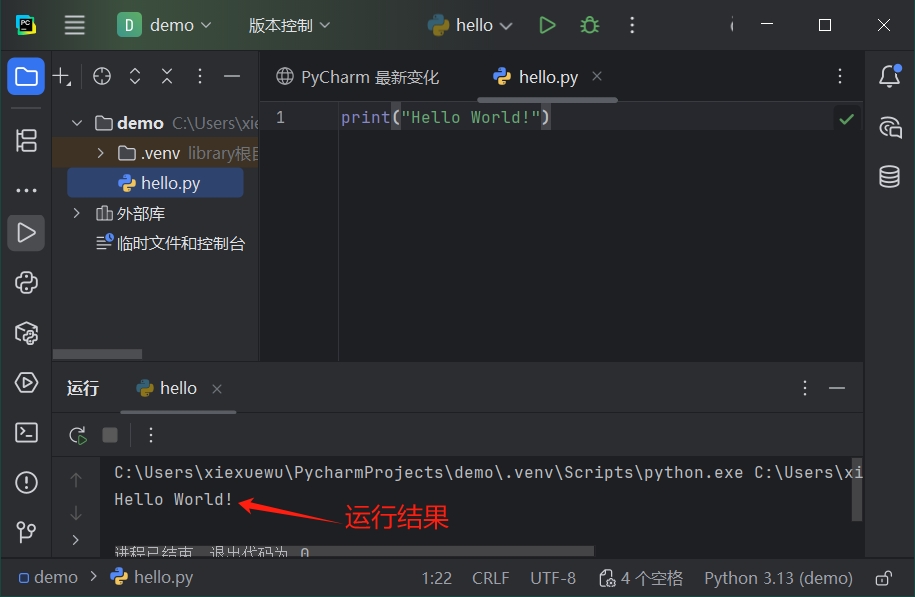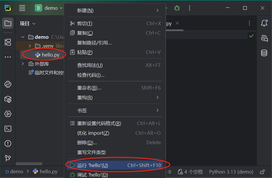 运行此 Python 程序也很简单,只需选择左侧工程目录中的 hello.py 文件,并右键选择"Run'hello'",如下图所示。