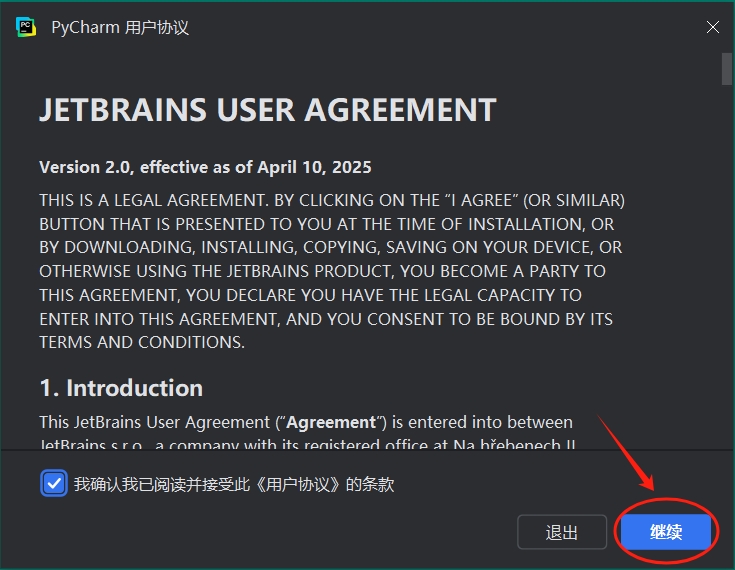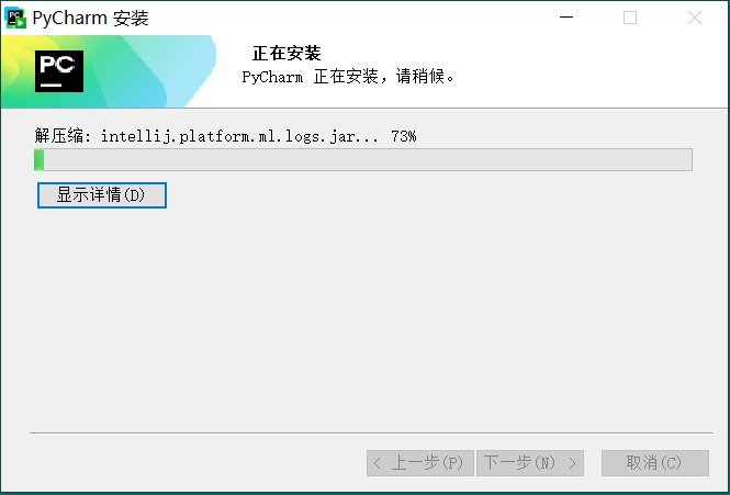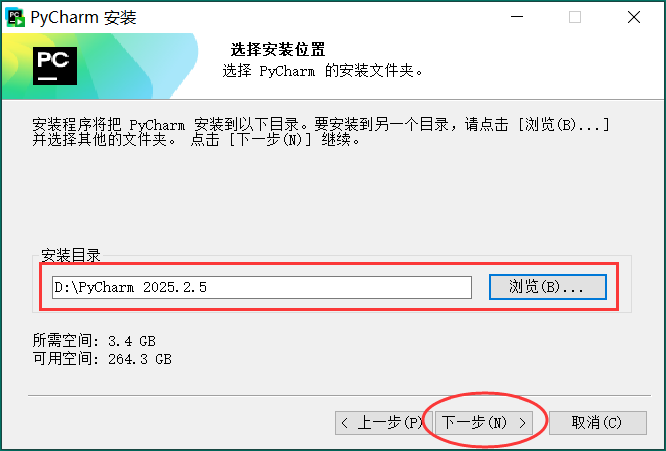 - 我使用的是 Windows x64 系统,下载得到 pycharm-2025.2.5.exe 安装包,双击启动安装,点击"下一步":
