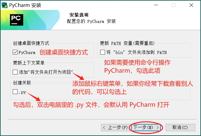 - 这里需要进行一些设置,可根据图中的标注,自行选择需要的功能,若无特殊需求,按图中勾选即可,继续点击"下一步":