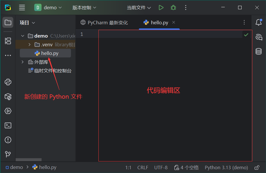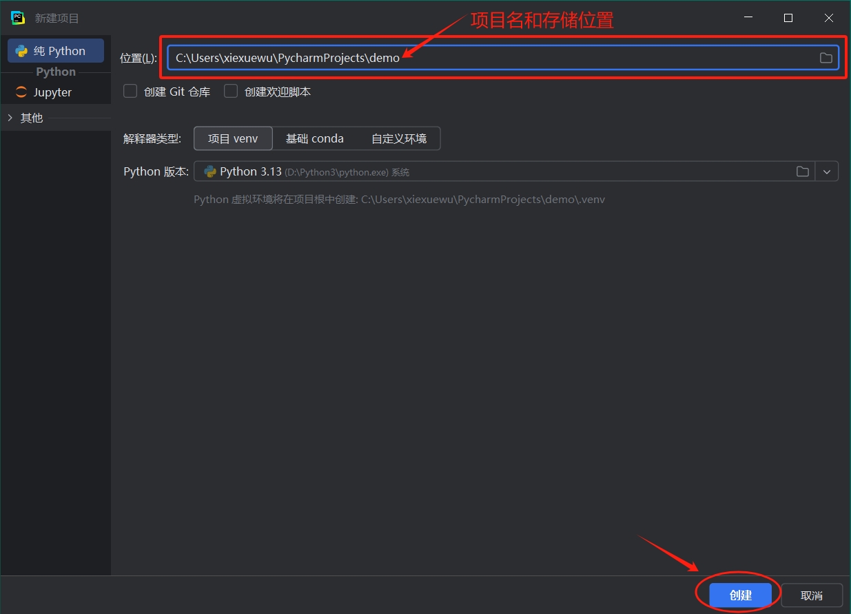 这里还可以选择使用的 Python 版本,比如图中使用的是 Python 版本是 3.13。最后点击"创建"。