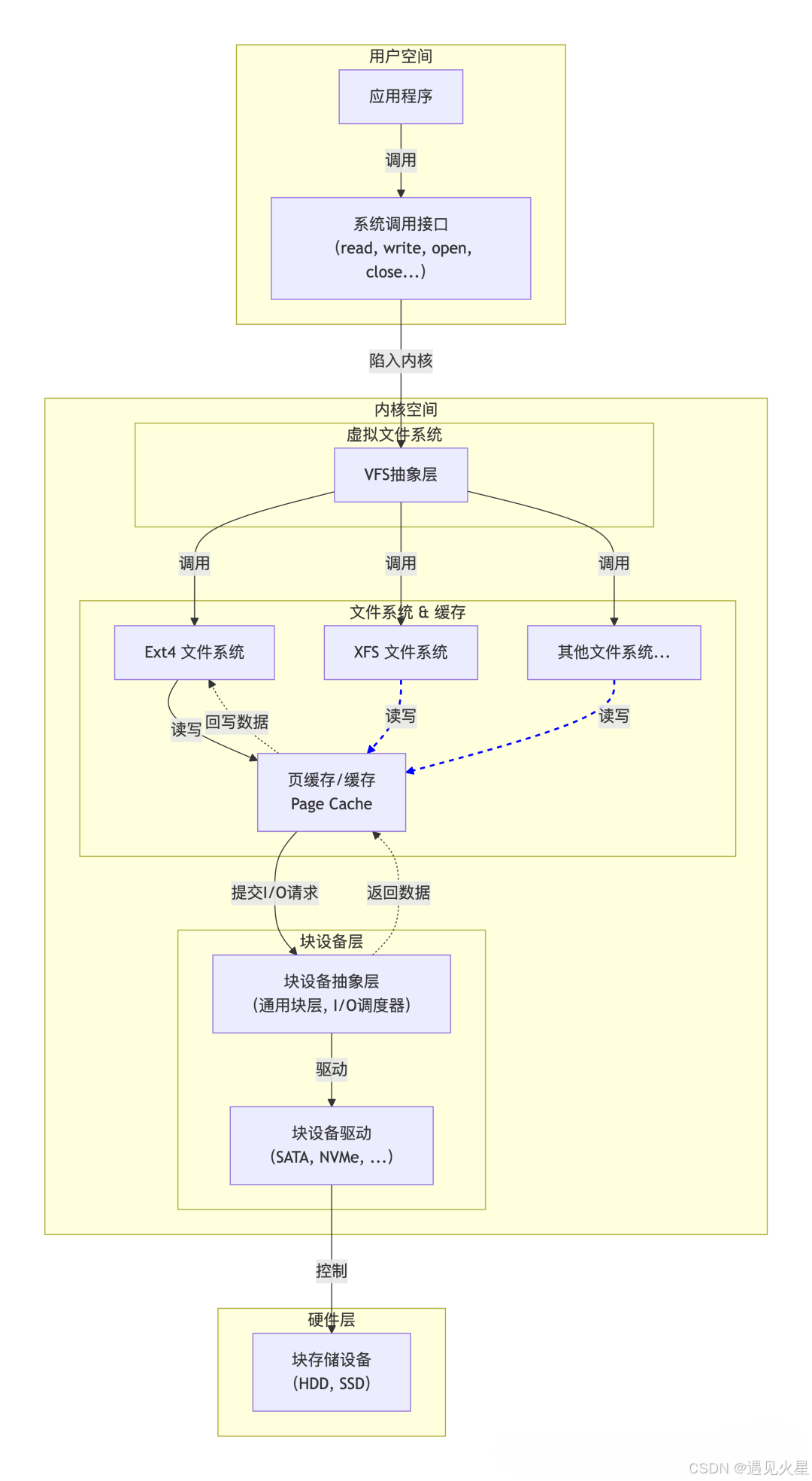 根据这个图,我们很清晰的就可以了解到从应用层→** 系统接口**→** 虚拟文件系统**→** 各种文件系统**→块设备层→设备驱动→磁盘硬件的整个过程,其中我们重点说一下块设备层。