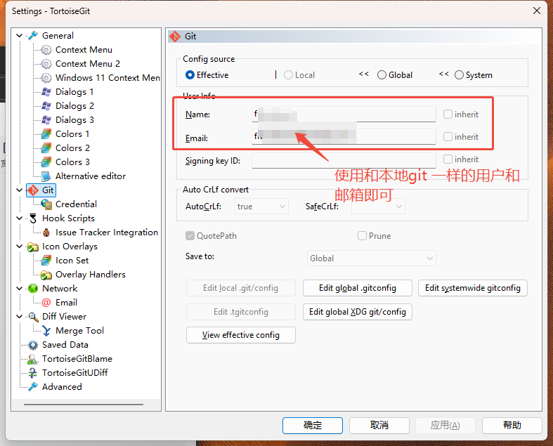 安装完成后,邮件选择 setting 后,按照下图先设置用户名和邮箱,与本地 git 保持一致即可