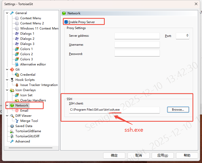 接下来设置使用本地 SSH 密钥, 在 Network 页面,SSH 配置中,将 SSH Client 设置为本地 Git 使用相同的 ssh.exe 即可。
