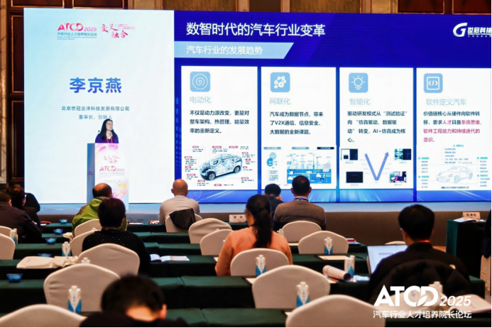 北京世冠金洋科技发展有限公司董事长李京燕在分论坛上发表了主题演讲,从产业视角深入分析了当前汽车人才培养面临的结构性矛盾,并分享了建模仿真技术在破解教学痛点方面的创新应用。