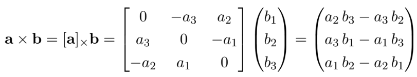 两个向量的**叉乘 (Cross product)**可以表示为一个反对称矩阵和一个向量的乘法: