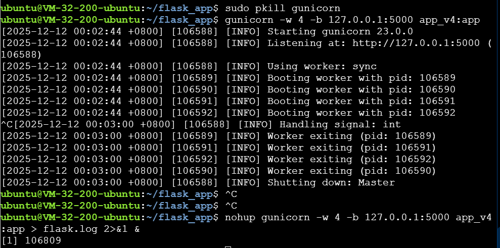 nohup gunicorn -w 8 -k gevent -b 127.0.0.1:5000 --timeout 240 app_v6:app > flask.log 2>&1 &