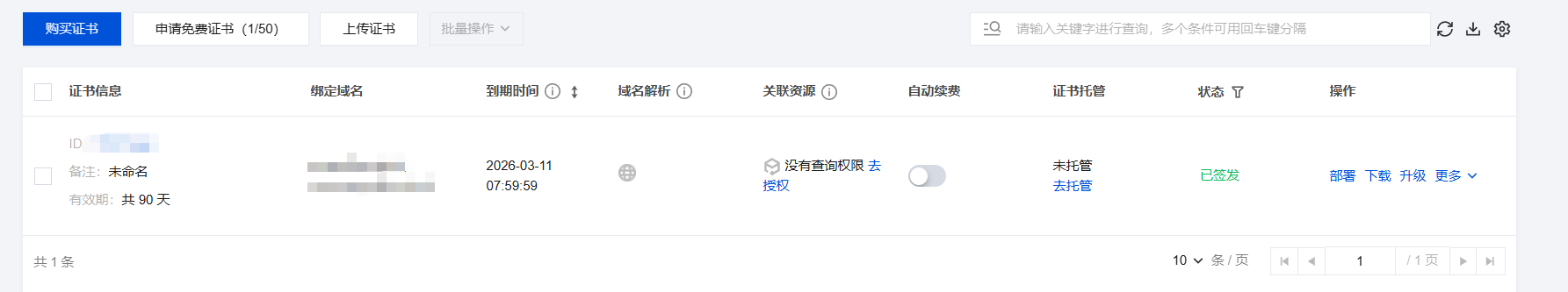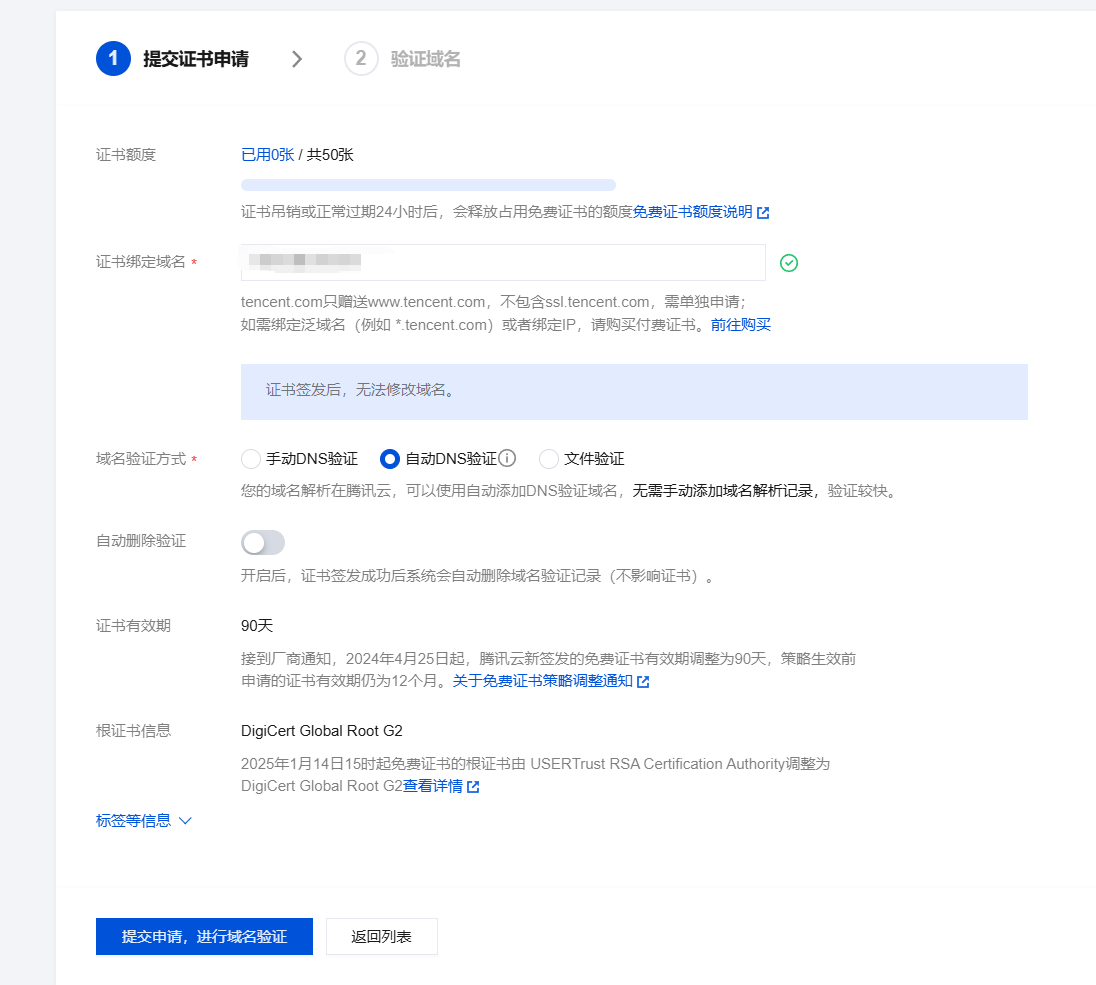 自动验证:腾讯云会自动给你的域名添加DNS验证记录,等待5-10分钟,证书状态变成「已签发」。