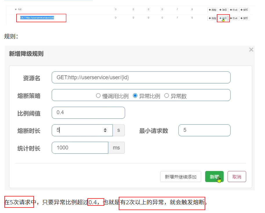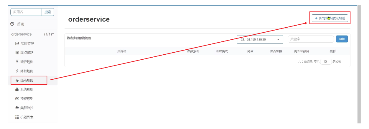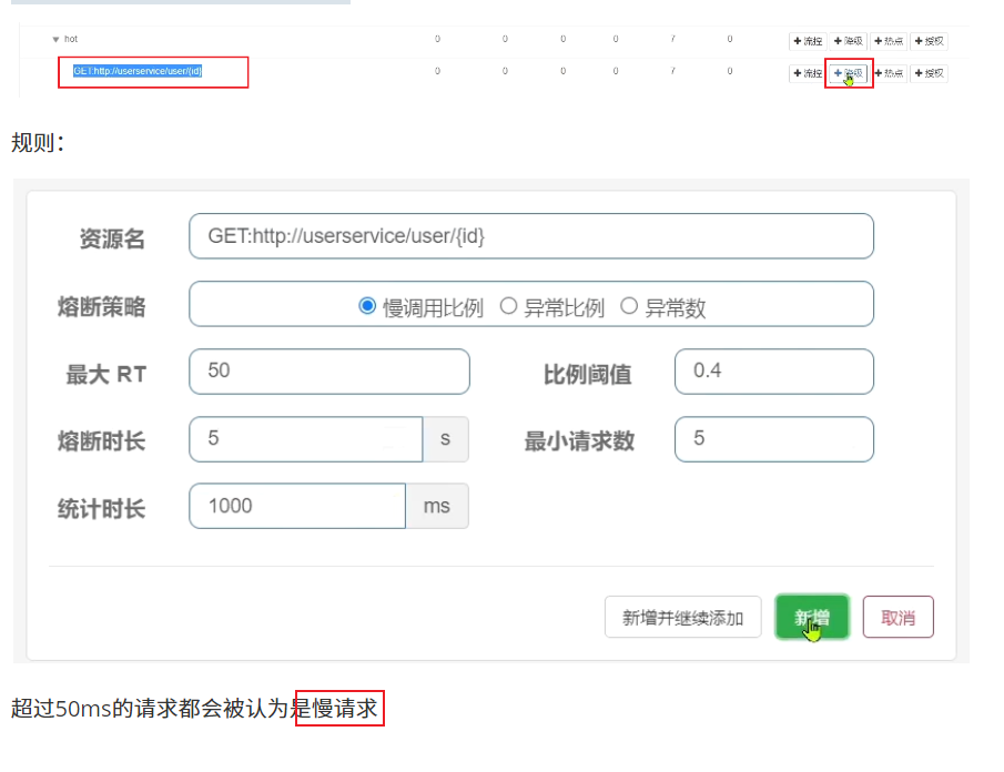 流控、熔断等都是针对簇点链路中的资源来设置的,因此我们可以点击对应资源后面的按钮来设置规则: