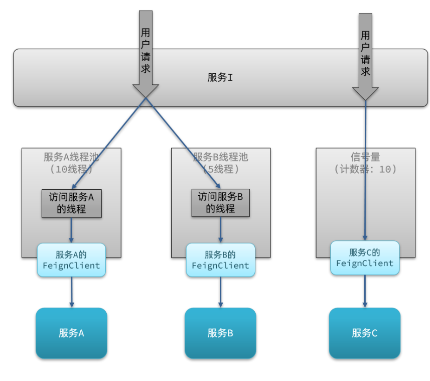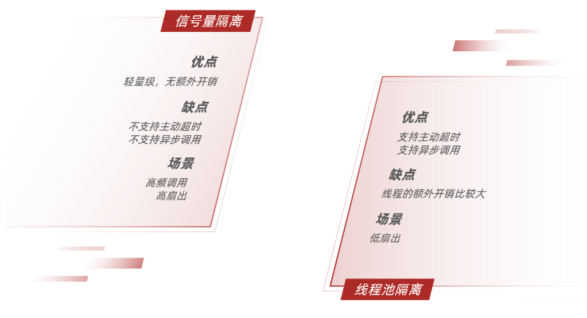 | 隔离策略 | 信号量隔离 | 线程池隔离/信号量隔离 |