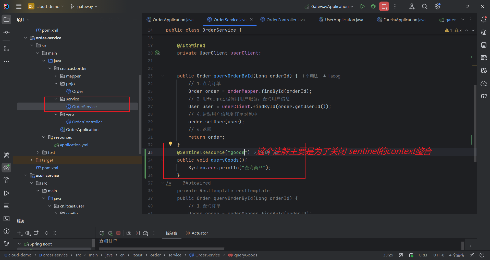 我们在order-service中整合sentinel,并连接sentinel的控制台,步骤如下: