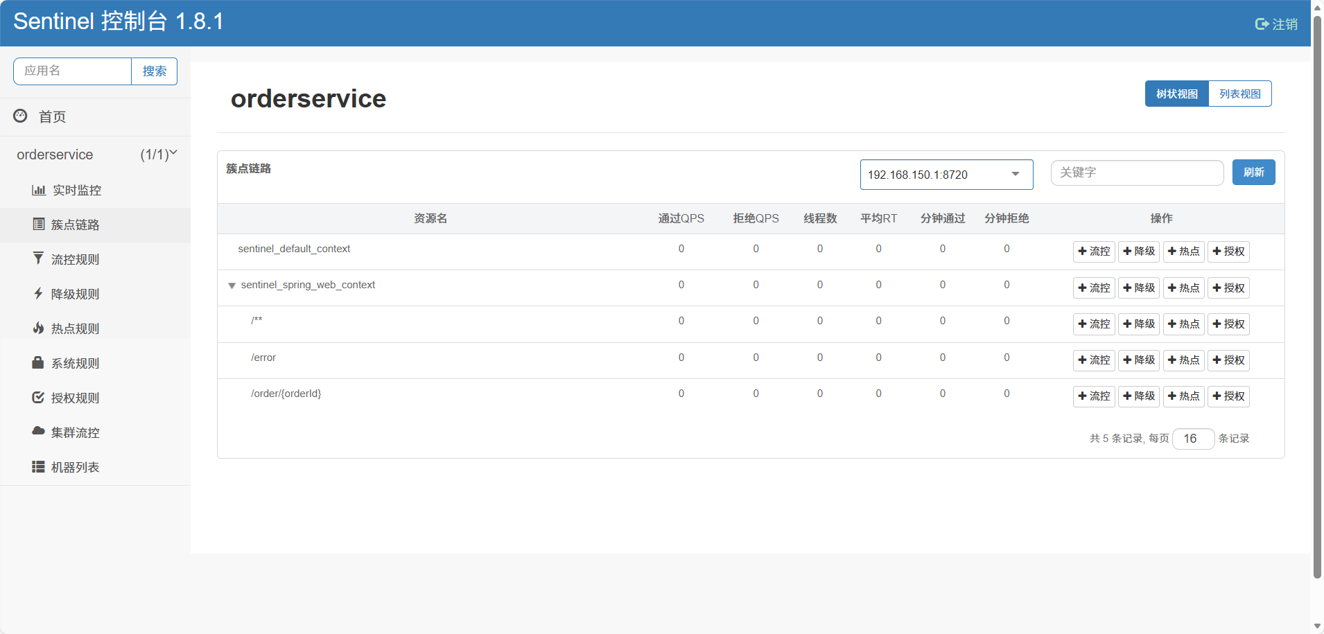 需求:给 /order/{orderId}这个资源设置流控规则,QPS不能超过 5,然后测试。