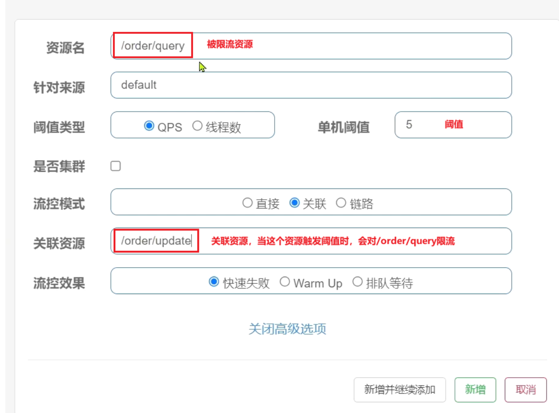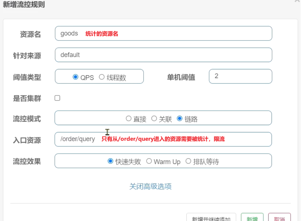在添加限流规则时,点击高级选项,可以选择三种流控模式: