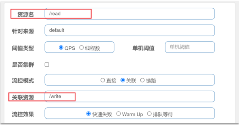 语法说明:当/write资源访问量触发阈值时,就会对/read资源限流,避免影响/write资源。