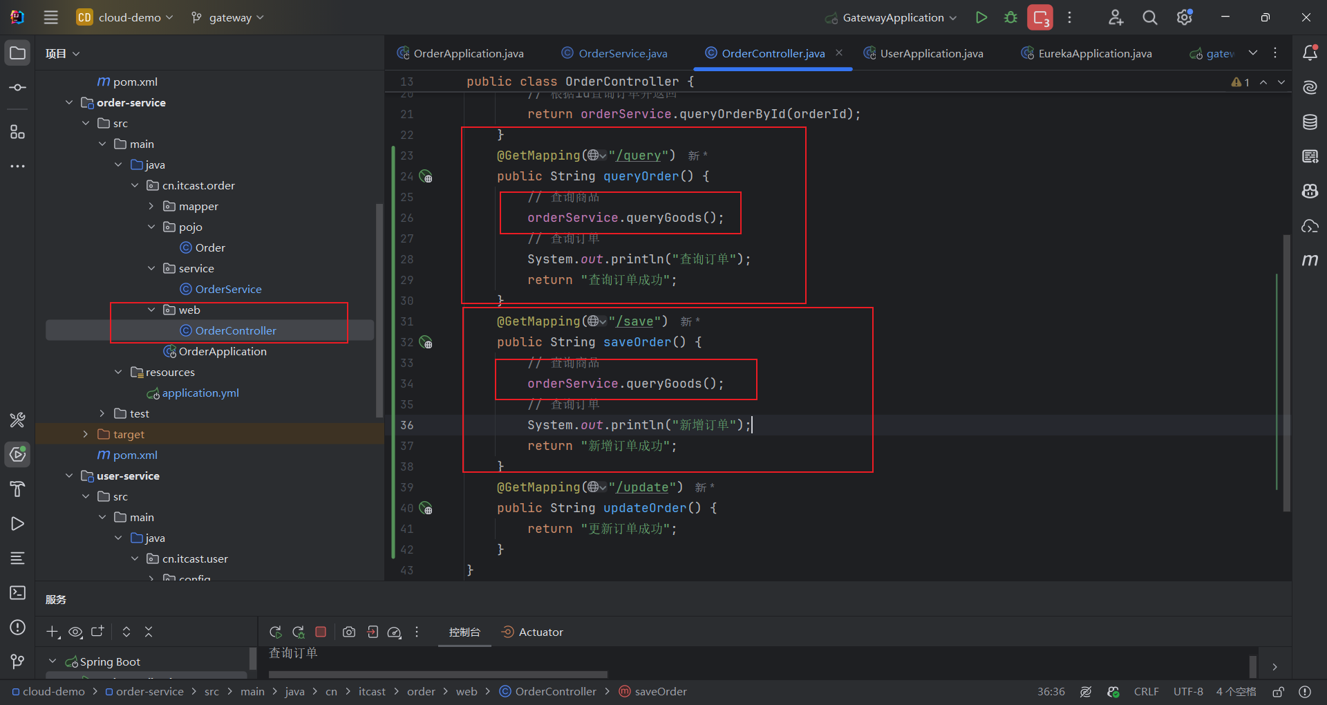 在OrderController新建两个端点:/order/query和/order/update,无需实现业务