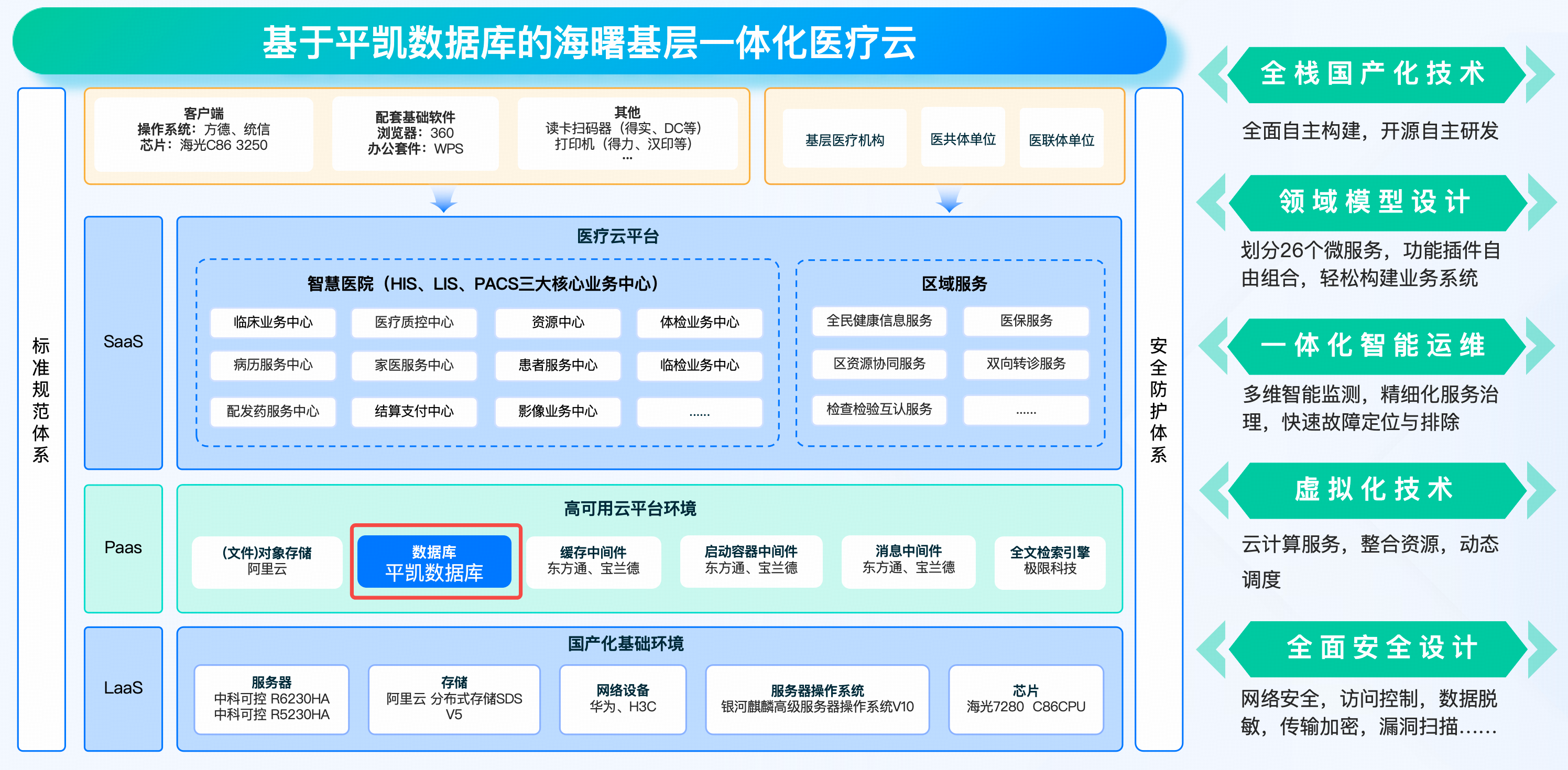 双方方案完成了从硬件到软件的 全栈国产化适配 。平凯数据库作为国产自研分布式数据库 ,其强一致多副本机制与数据加密技术 ,与金唐软件系统的权限管控功能深度融合,满足《数据安全法》《个人信息保护法》对医疗数据的合规要求 。联合方案深度适配了"三医联动"、"县域医共体"、"全民健康信息平台建设"等政策要求 ,已在海南省"三医联动一张网"项目中构建标杆模式 ,全面落实了全业务链路的国产化替代 。