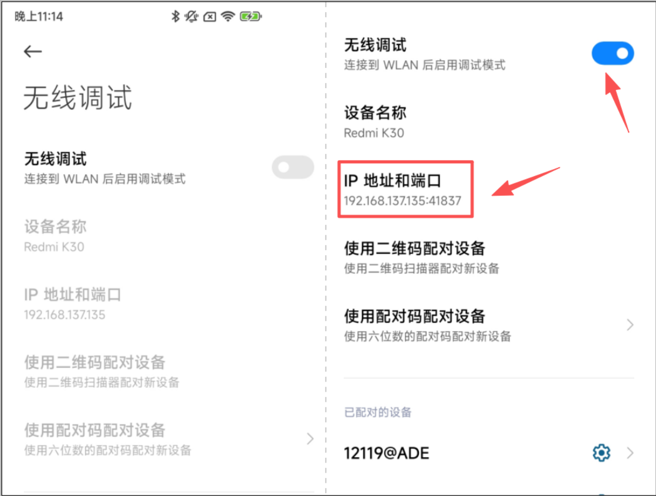 根据这个理念,我们研究了一下手机开放的功能和入口,发现手机开发者选项中,除了"USB调试"之外,单独列有"无线调试"这个入口。开启了无线调试之后,手机会在WLAN局域网的IP中,开启一个动态的IP:Port的入口,允许外部网络的adb客户端去连接它,从而快速的进行访问。