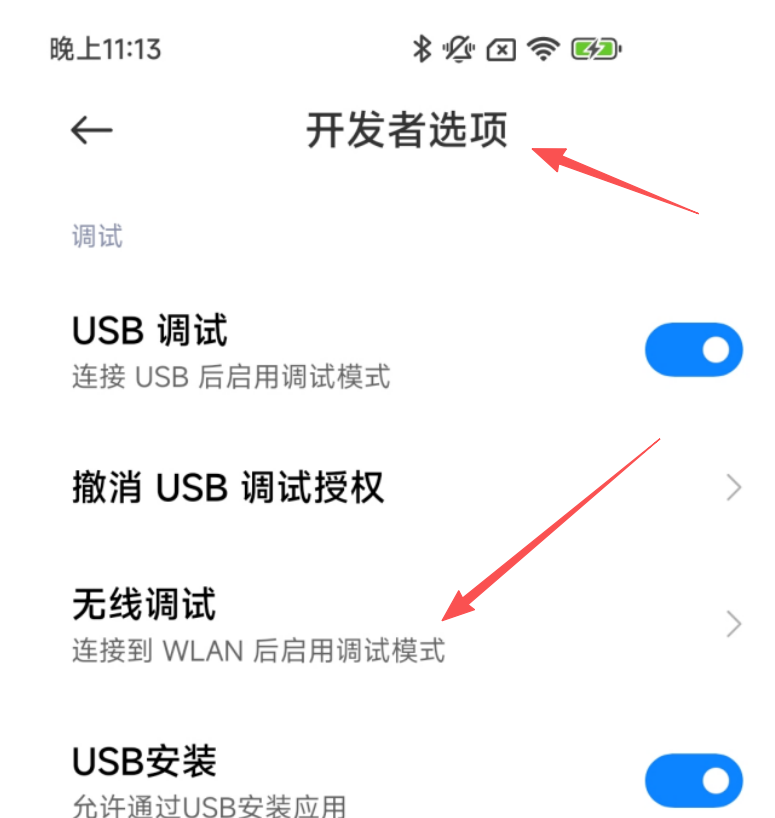 手机自带的设置程序,开启了开发者模式后,基本都有【USB调试】和【无线WLAN调试】的访问入口,如下图所示: