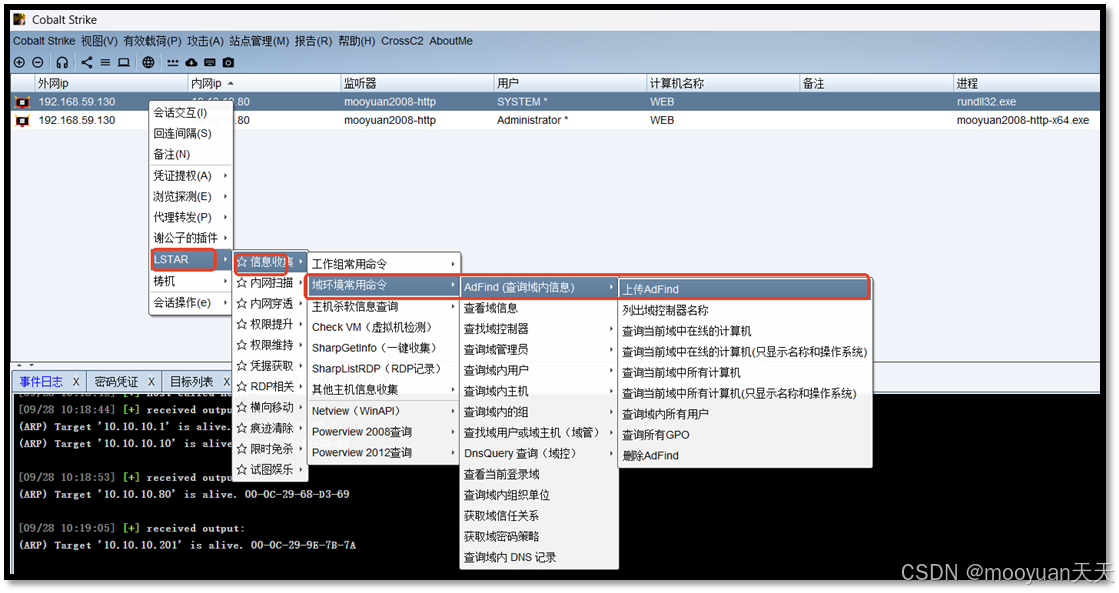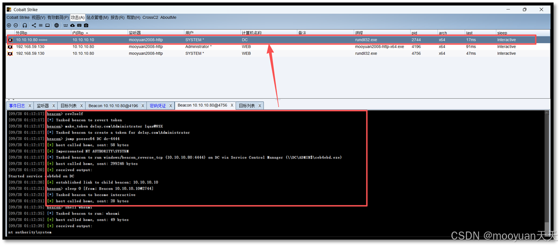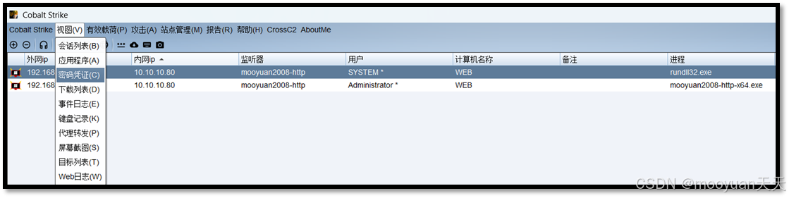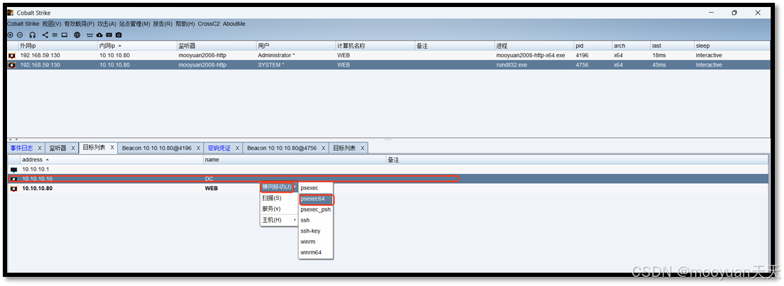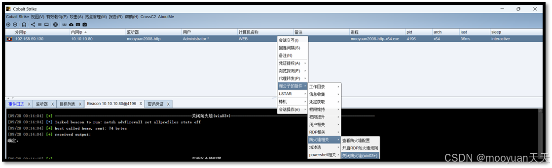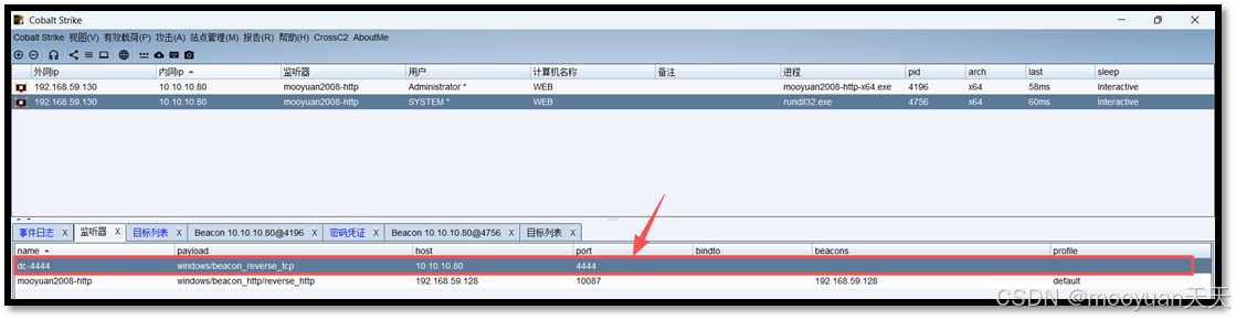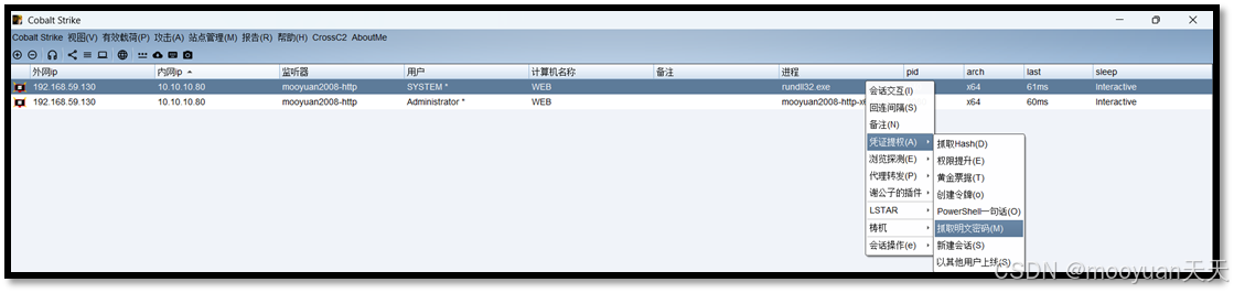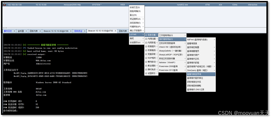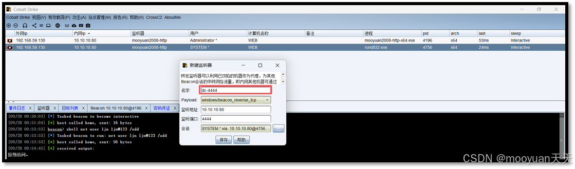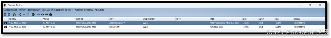 通过冰蝎执行2008-924.exe后,查看cs,如下所示进程mooyuan2008-http-x64.exe计算机名为win7的系统中,监听器为mooyuan2008-http,内网ip地址为192.168.59.130,内网ip地址为10.10.10.80,结构为x64。