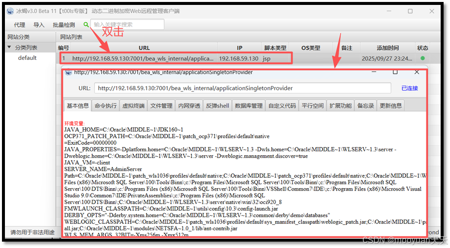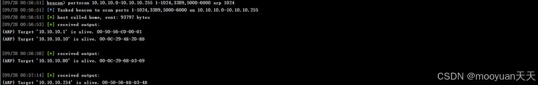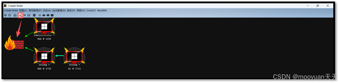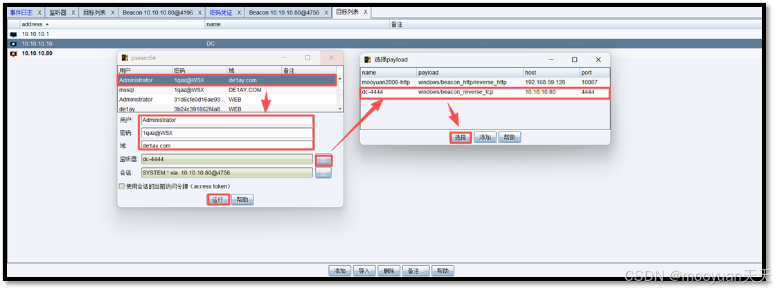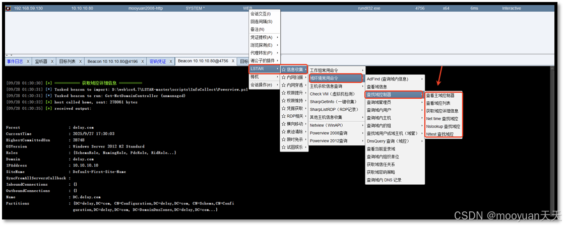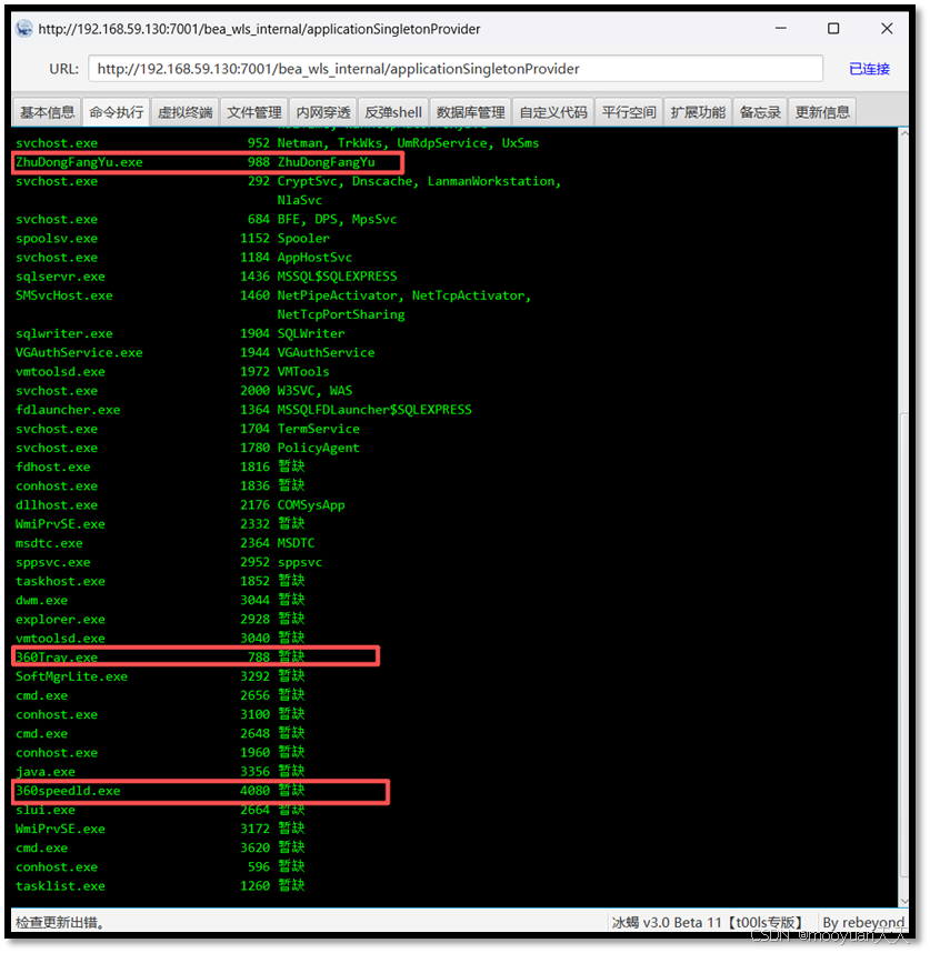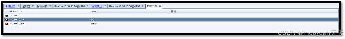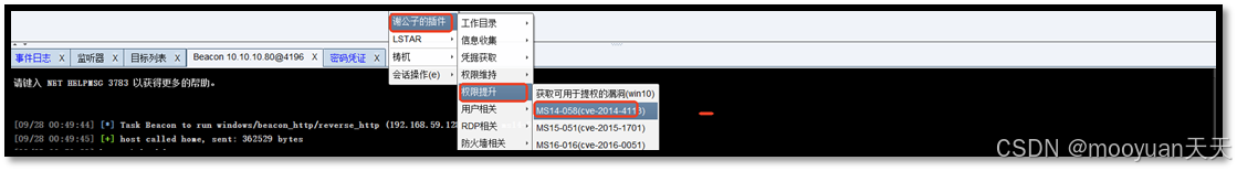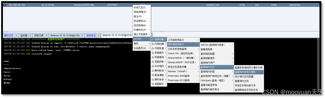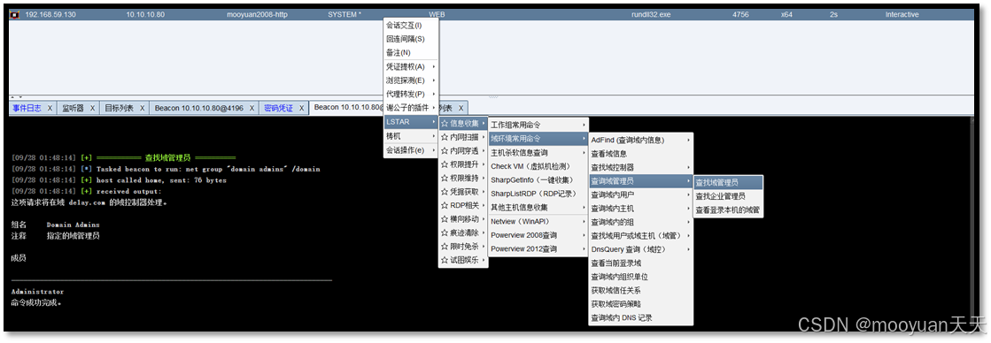 通过冰蝎执行2008-924.exe后,查看cs,如下所示进程mooyuan2008-http-x64.exe计算机名为win7的系统中,监听器为mooyuan2008-http,内网ip地址为192.168.59.130,内网ip地址为10.10.10.80,结构为x64。