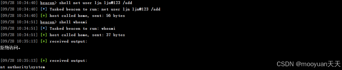 点击运行后执行如下所示,成功上线DC beacon,执行whoami,提示是system用户。