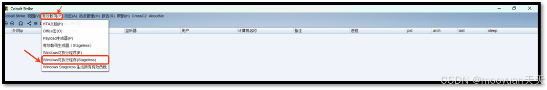 payload 是将要投放到目标主机上的可执行文件,即Beacon代理。在菜单栏-有效载荷(P)的菜单下, 选择"Windows可执行文件(Stageless)",如下图所示。
