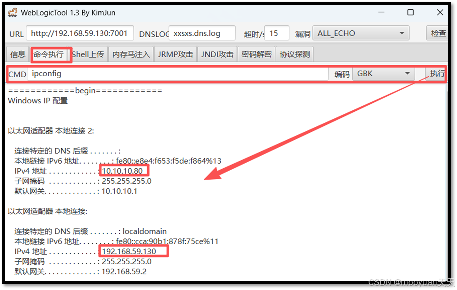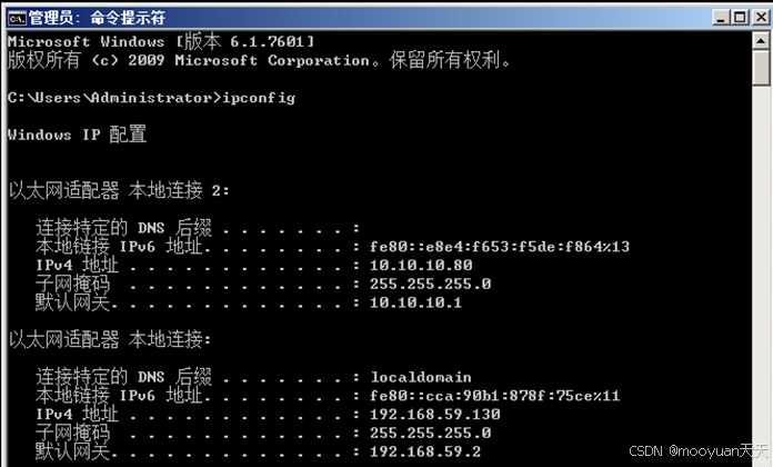 配置完毕后使用ipconfig命令查看,如下所示与Kali处于同一网段192.168.59.0/24(vmnet8网段)的192.168.59.130就是我们的渗透目标。