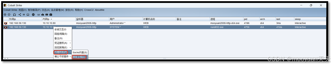 选中10.10.10.80的会话(system用户),右键选择代理转发-转发上线