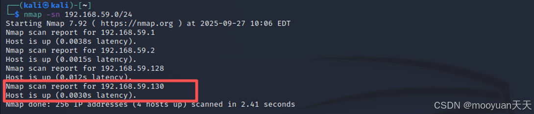 nmap的运行结果如下所示,扫描结果显示该网段共有4台活跃主机:192.168.59.1为CS操作主机(攻击控制端),192.168.59.2为网关设备,192.168.59.128为Kali攻击机,192.168.59.130为目标Web服务器。