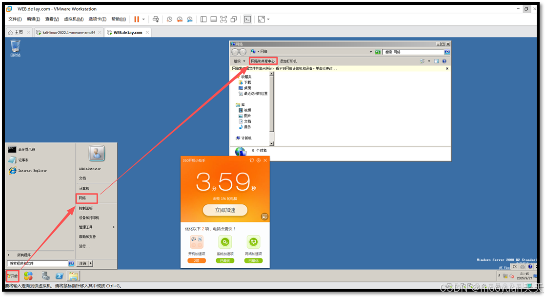 接下来配置ip地址自动获取,点击"开始-网络-网络和共享中心", 启动过程中发现电脑中安装了360杀毒软件,如下所示。