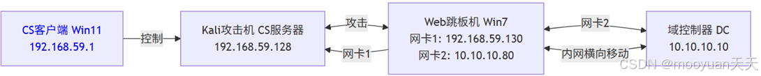 本文对红日靶场2进行渗透,渗透环境如下拓扑所示。Kali攻击机(192.168.59.130)作为Cobalt Strike团队服务器,与位于同一Vmnet8网段的Windows 11客户端(192.168.59.1)共同构成攻击阵地。首要目标是作为跳板机的Windows 7系统(Web服务器,安装Weblogic服务,开放7001端口号),它利用Vmnet1网卡(10.10.10.80)连接到内部网络。最终目标是通过攻破内网域控制器(10.10.10.10),从而掌控整个核心域环境。整个拓扑清晰地模拟了从外网突破边界、横向移动至内网关键节点的经典攻击链。