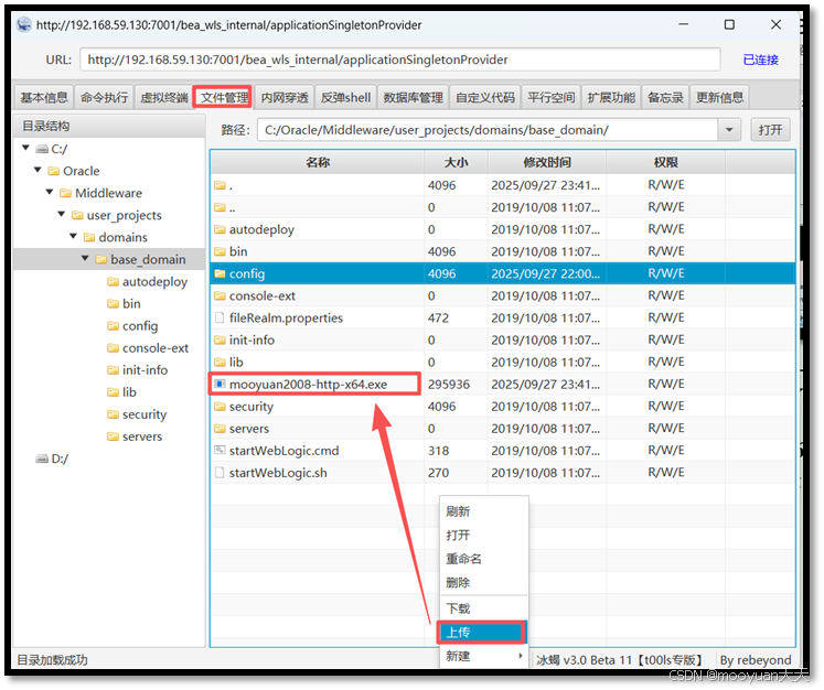 通过冰蝎上传baecon文件mooyuan2008-http-x64.exe到服务器中,具体步骤如下所示。