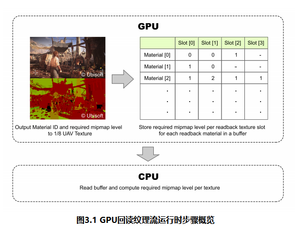 图 3.1 展示了我们系统的概览。在 G-Buffer 渲染阶段,我们从像素着色器将所需 Mipmap 层级的信息写入一个 UAV(无序访问视图)纹理中。该 UAV 纹理具有两个 16 位无符号整数通道。R 通道存储材质 ID;G 通道则存储最多四个 UV 变量计算出的 Mipmap 层级。这意味着单个材质最多可支持四个独特的 UV 变量用于回读式纹理流送。我们称这四个位置为回读纹理槽位。这些信息经过处理后回读至 CPU,通知纹理流送器上一帧使用了哪些纹理及 Mipmap 层级。以下章节将详细阐述每个步骤。