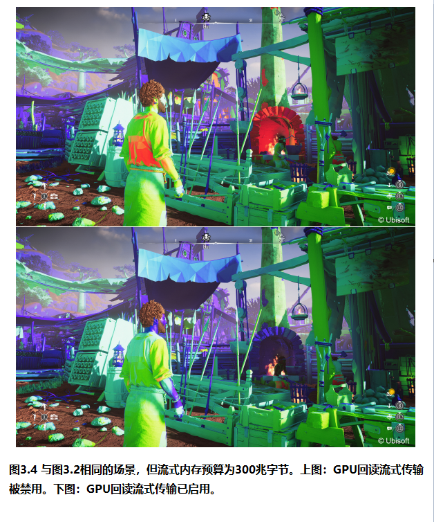 当屏幕分辨率为 4K 时,在某些情况下使用默认的纹理 Mipmap 加载距离会观察到质量不足。GPU 回读式纹理流送有助于检测这些情况并加载缺失的纹理 Mipmap。在图 3.3 中,绿色区域表示像素着色器采样了当前已加载的最精细 Mipmap 层级。这是理想情况,因为我们没有为未使用的纹理数据浪费内存。红色和洋红色区域表示像素着色器试图采样一个未加载的 Mipmap 层级。这意味着质量损失,表现为纹理模糊,因为纹理流送导致所需的 Mipmap 层级不可用。