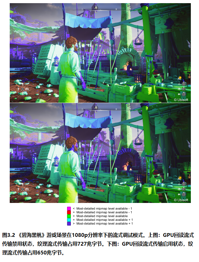 利用 GPU 反馈进行纹理流送有多种方案。某些平台提供硬件特性以协助计算 GPU 所需的 Mipmap 层级,例如 DirectX 12 的采样器反馈流送功能。由于不同平台图形 API 差异巨大,我们在《碧海黑帆》中选择了软件方案,以确保跨平台行为一致、实现统一。