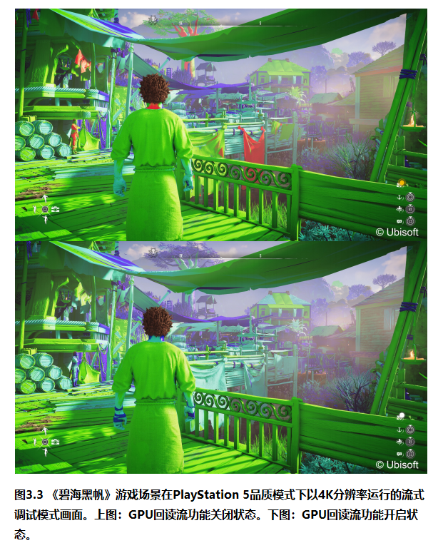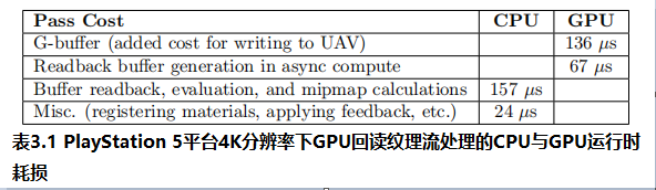 表 3.1 展示了在 PlayStation 5 的"画质模式"和 4K 分辨率下,启用 GPU 回读式纹理流送所增加的额外成本。考虑到该技术在提高内存使用效率方面的显著优势,它提供了一个成本相当低的解决方案。