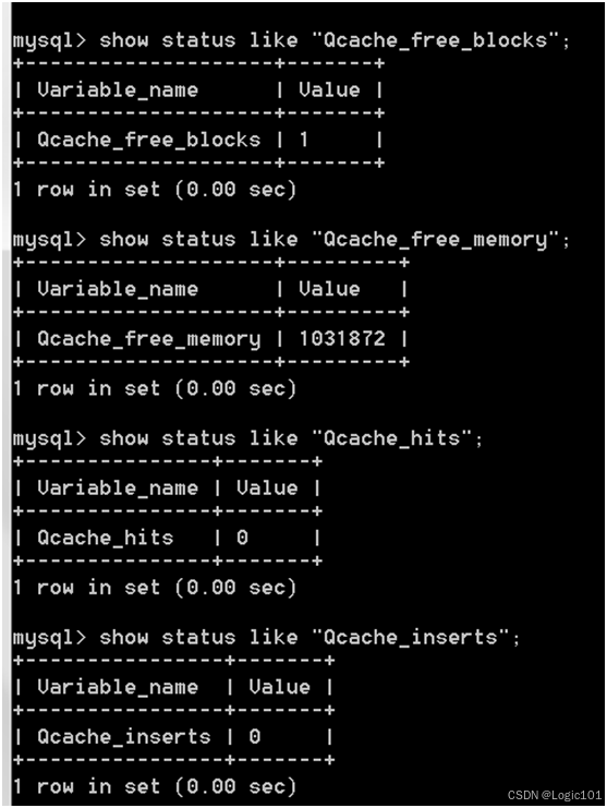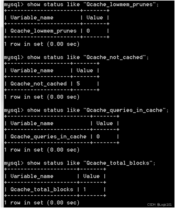 【实验5-5】使用SHOW语句获取与查询缓冲相关的指标:Qcache_free_blocks、Qcache_free_memory、Qcache_hits、Qcache_inserts、Qcache_lowmem_prunes、Qcache_not_cached、Qcache_queries_in_cache、Qcache_total_blocks。