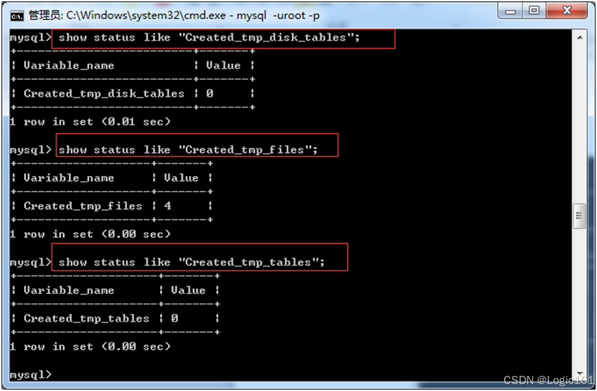【实验5-6】使用SHOW语句获取关于临时表的指标Created_tmp_disk_tables、Created_tmp_files、Created_tmp_tables。