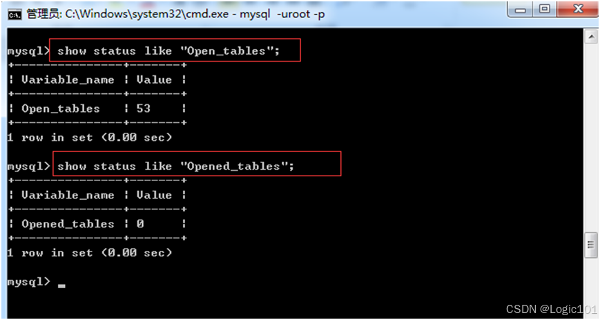 【实验5-7】使用SHOW语句获取访问表的数量指标Open_tables和Opened_tables。