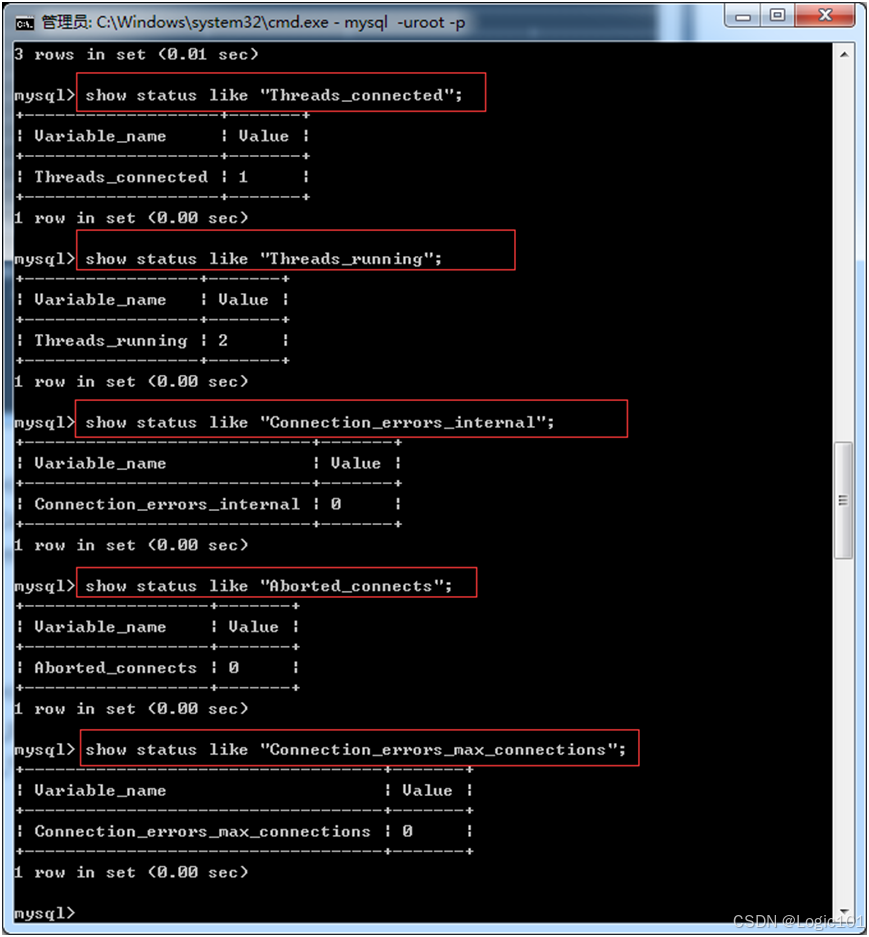 【实验5-3】使用SHOW语句查询连接检查指标Threads_connected、Threads_running、Connection_errors_internal、Aborted_connects和Connection_errors_max_connections。