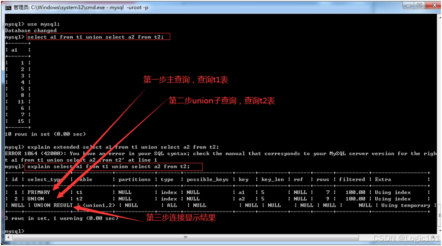 【实验5-10】使用EXPLAIN EXTENDED命令查看带有UNION子句的SELECT的执行计划。