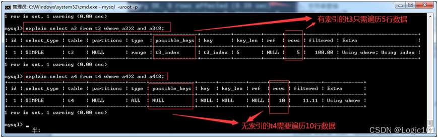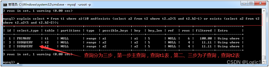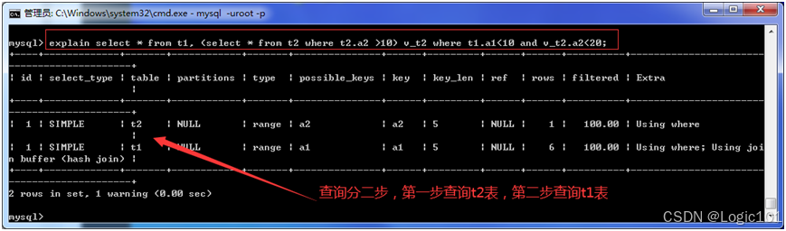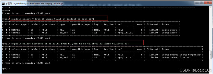 【实验5-11】使用EXPLAIN EXTENDED命令查看如下语句的执行计划: