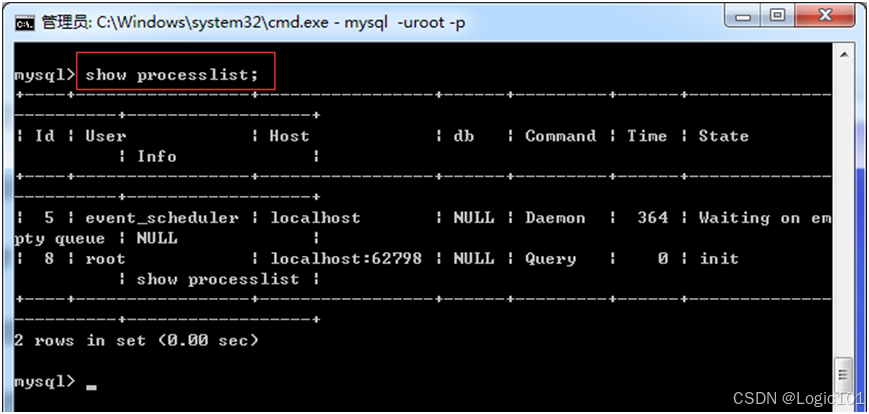 【实验5-8】使用SHOW PROCESSLIST命令查询用户正在运行的线程信息协助进行故障诊断。