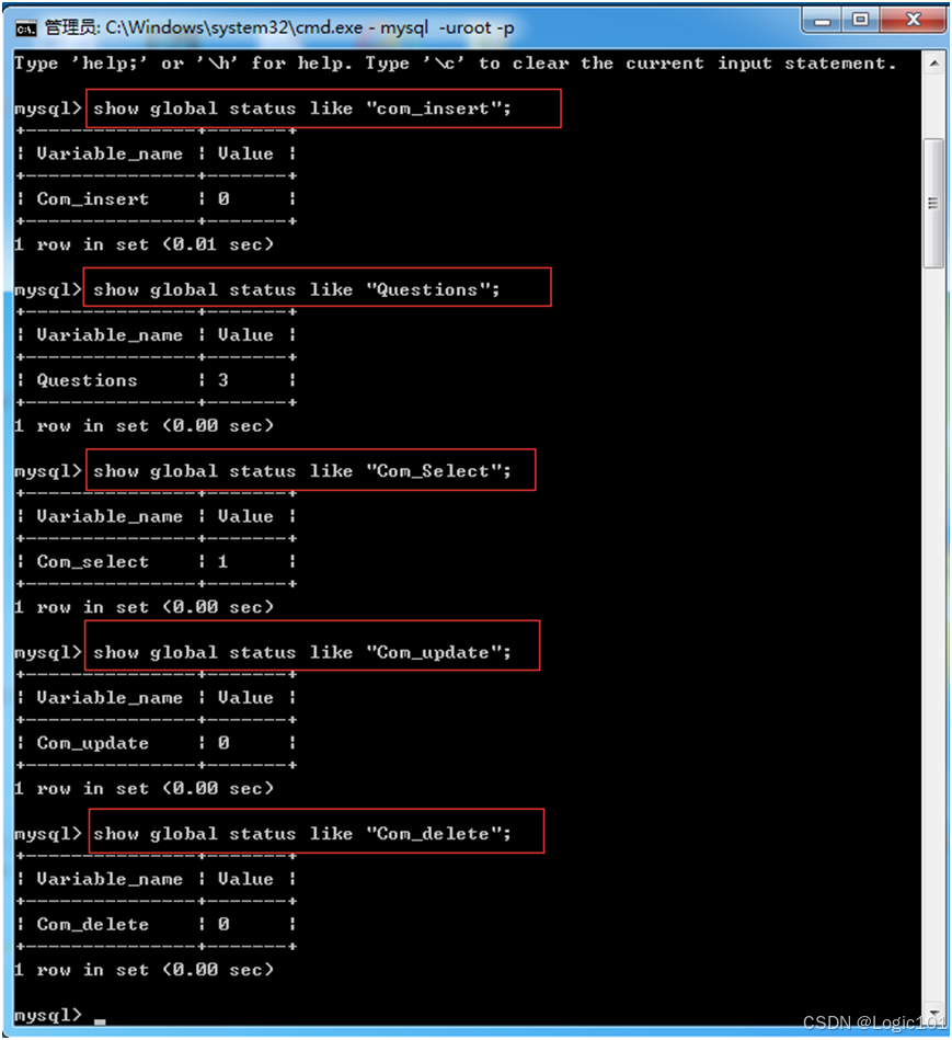 【实验5-1】使用SHOW语句查询设备吞吐量Questions、Com_Select、Com_insert、Com_update、Com_delete几个指标值。