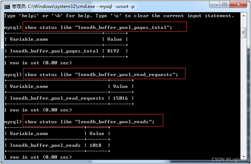 【实验5-4】使用SHOW语句查询Innodb缓冲区指标Innodb_buffer_pool_pages_total、Innodb_buffer_pool_read_requests、Innodb_buffer_pool_reads。