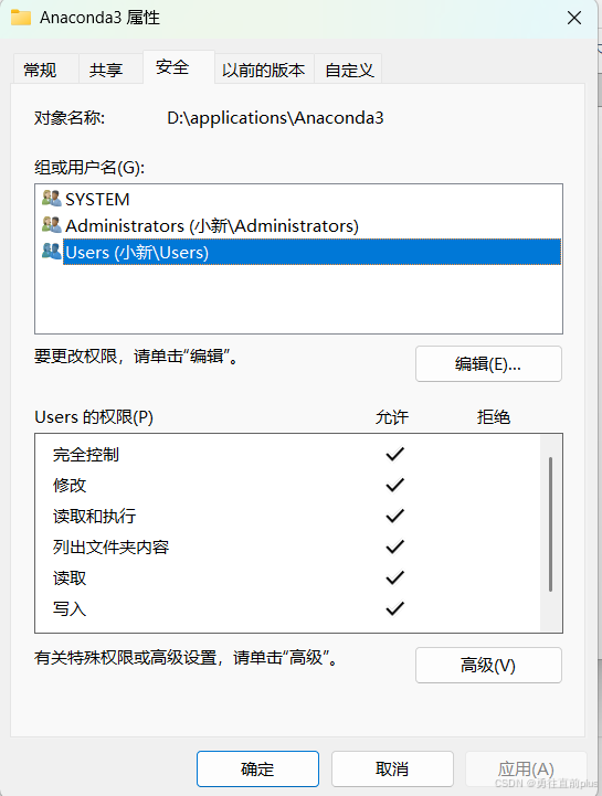 第二个选择是,修改anaconda 安装包的权限,使得普通用户也有权限修改文件内容。右键-属性-安全-修改权限