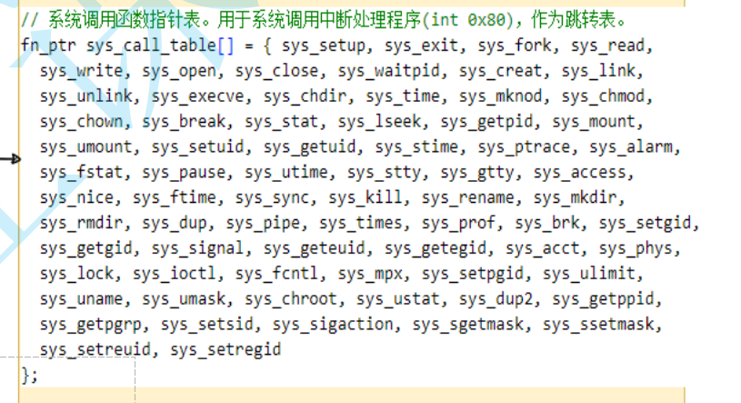 上图实际是一个函数指针数组,存储了各种系统调用方法。所以每个系统调用都有唯一的下标(系统调用号)